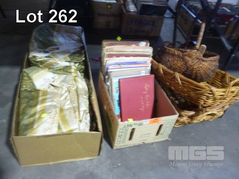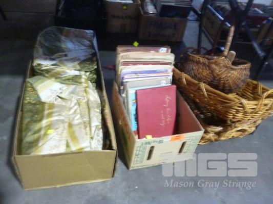 CANE BASKETS, MUSIC BOOKS & RUBBER BACK CURTAINS, 3 x CARTONS
