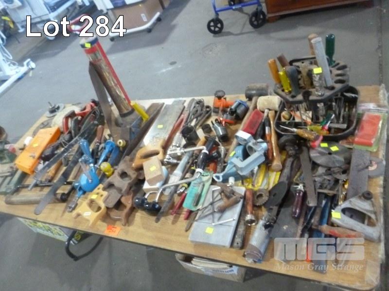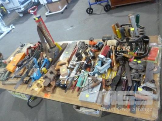 ASSORTED HAND TOOLS INCLUDING SAWS, SCREWDRIVERS ETC - 1 TABLE.