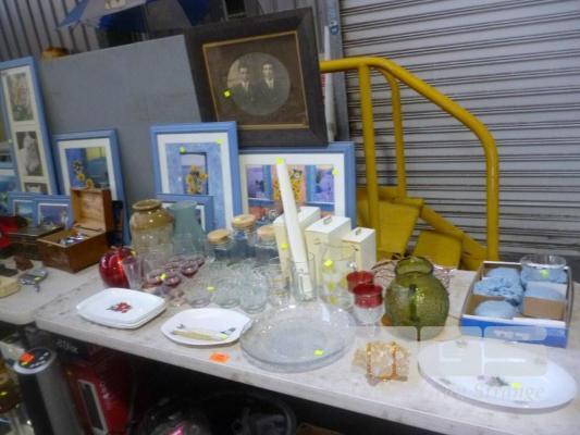 RETRO CANISTERS & ANODIZED APPLE ICE BUCKET, ASSORTED GLASSWARE, MAGILL POTTERY 1 GALL JAR ETC - 1 TABLE.