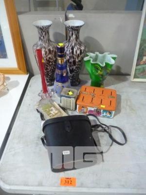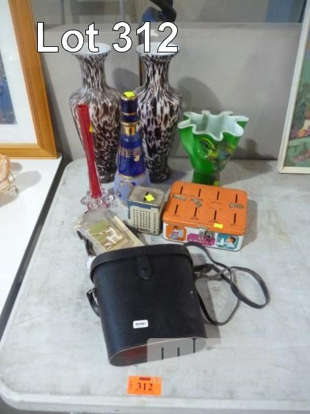 ART GLASS VASES, BINOCULARS, THE SAVINGS BANK OF SOUTH AUSTRALIA LOCKABLE MONEY BOX, BUDGET TIN, ETC