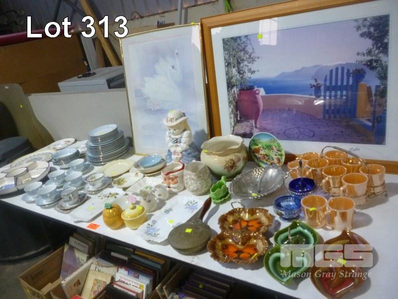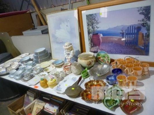 4 PERSON NORITAKE DINNER SET, SERVING PLATTERS, SUGAR BOWLS, JUGS & PRINTS ETC - 1 TABLE.