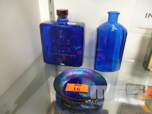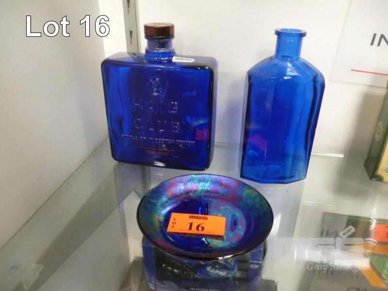 HAND CRAFTED GLASS BOWL BY GLENN HOWLETT, BRISTLE BLUE BOTTLE & HAIG CLUB BLUE BOTTLE