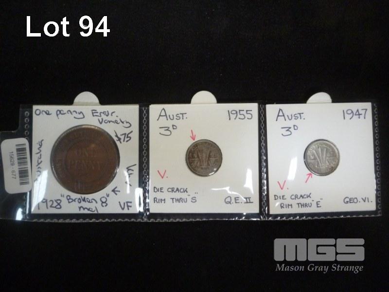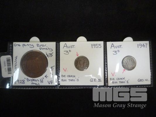 3 x AUSTRALIAN ERROR COINS 1928 PENNY - 1947-1955 THREEPENCE
