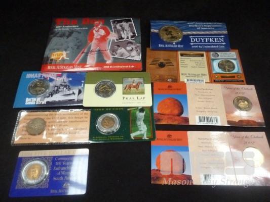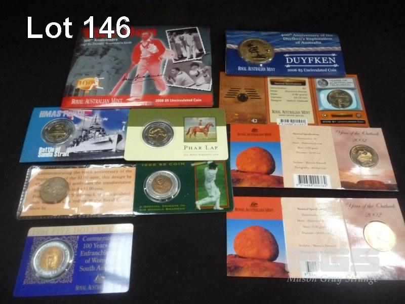 UNCIRCULATED AUSTRALIAN COMMEMORATIVE COIN PACKS, 3 x $5, 6 x $1 ETC (10)