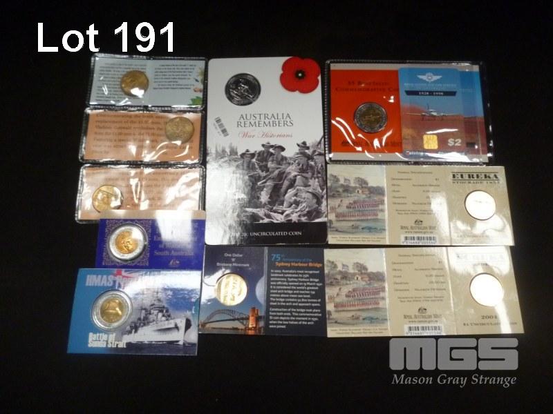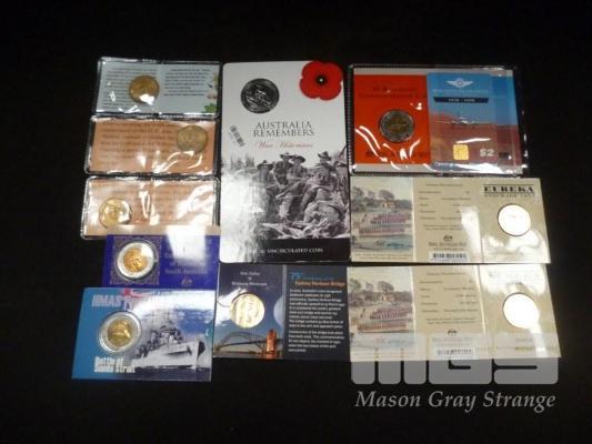 UNCIRCULATED AUSTRALIAN COMMEMORATIVE COIN PACKS, 6 x $5, 4 x $1, INCLUDING 2006 TV RARE MINT MARK (10)
