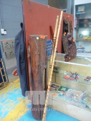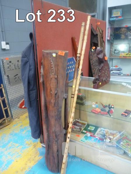 APPROX 1.5m HIGH CARVED TIMBER ORNAMENT (ANIMALS ON A LOG) & 2 x CANE PIECES, 1 x WITH DOT PAINTINGS