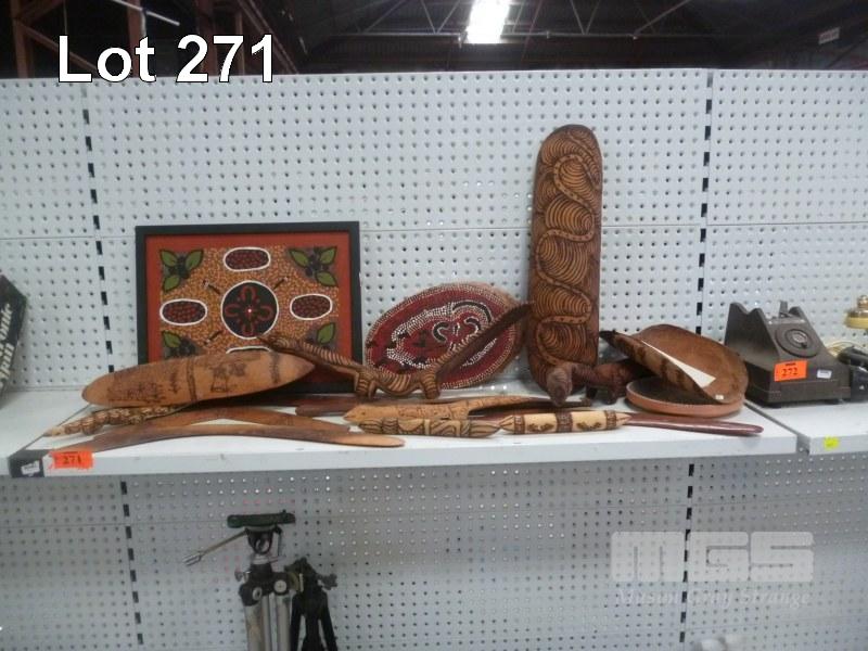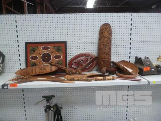 INDIGENOUS ART INCLUDING DOT PAINTINGS, CLAP STICKS & COOLAMON