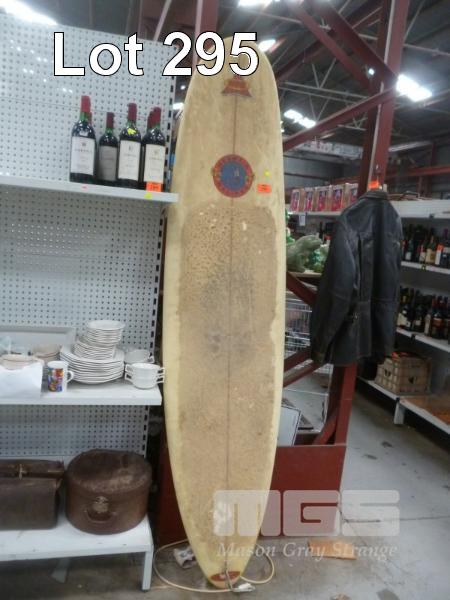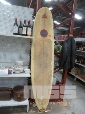 MERMAID MALIBUS 3 FIN SURFBOARD, 7 FOOT 5 INCH MARKED "GEORGE" AT SIZE MARKING
