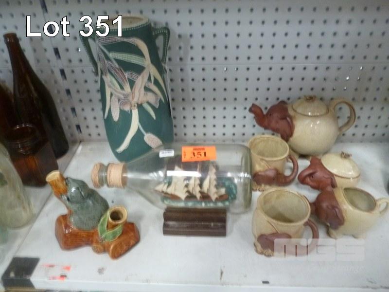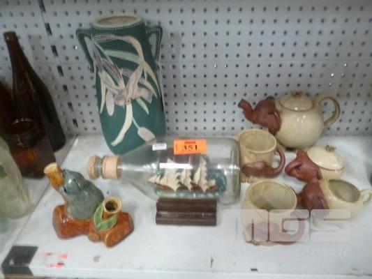 ELEPHANT TEA SET, ORIENTAL EXPORT VASE, AUSTRALIAN POTTERY KOALA, SHIP IN A BOTTLE, ON STAND