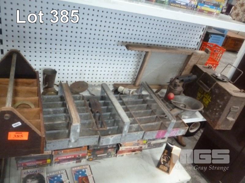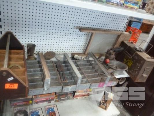 ASSORTED RUSTIC ITEMS, AMMO BOX, CARRY TRAYS, BURNER & WASHBOARD, ALL FAULTS