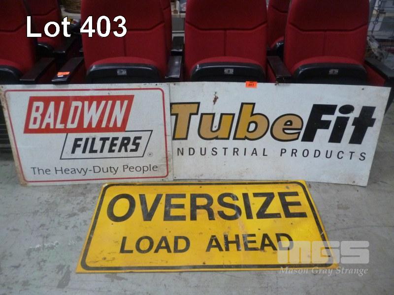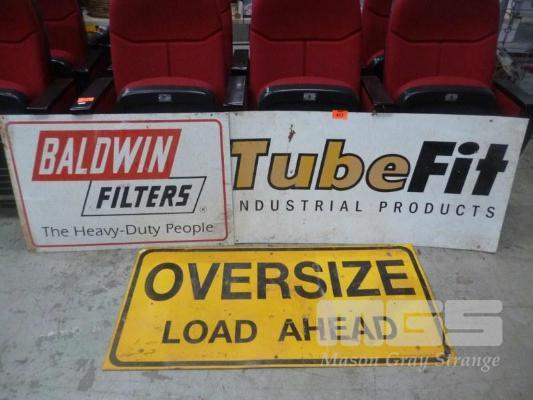 3 x SCREEN PRINT SIGNS, "TUBEFIT INDUSTRIAL PRODUCTS", "BALDWIN FILTERS" & "OVERSIZE LOAD AHEAD"-DOUBLE SIDED