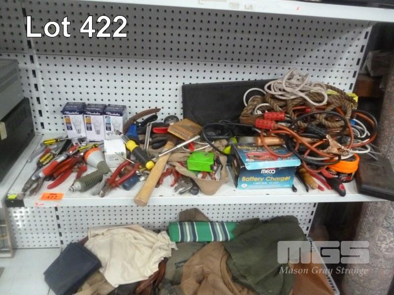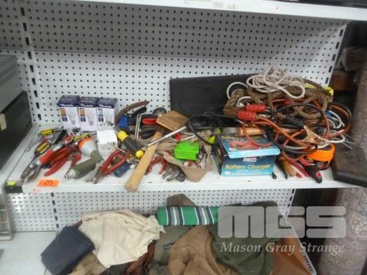 ASSORTED HAND TOOLS, GARDENING, BATTERY CHARGER ETC
