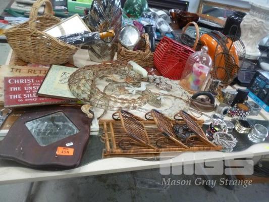 ASSORTED WICKER BASKETS, WALL ART, BRACELETS ETC (1 x TABLE)
