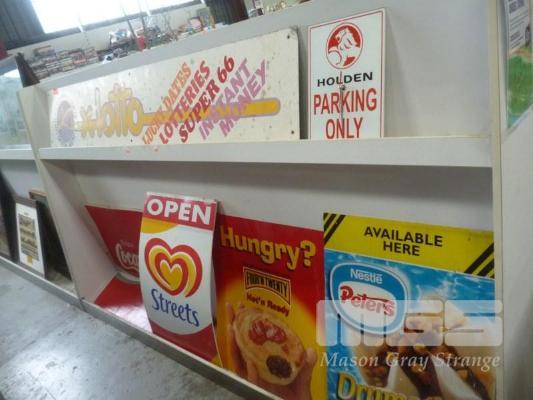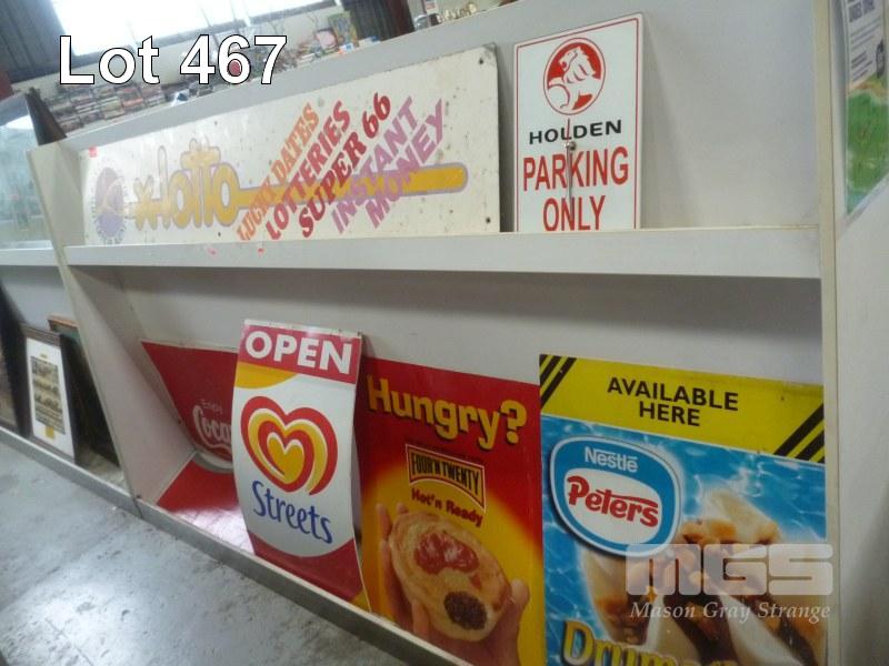 X-LOTTO SCREEN PRINT SIGN, 5 x ASSORTED CORE FLU SIGNS & HOLDEN WALL CLOCK (ALL FAULTS)
