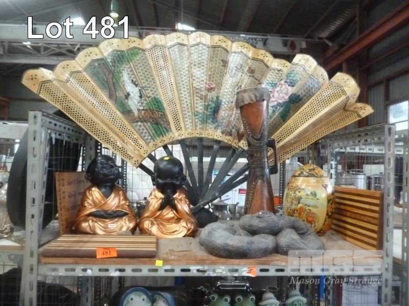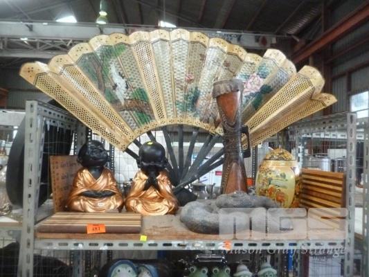LARGE DECORATIVE FAN, RESIN ORNAMENTS, SNAKE SKIN DRUM ETC