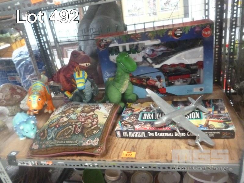 CHRISTMAS TRAIN SET, TOY DINOSAURS, NBA BOARD GAME, ALUMINIUM PLANE & CUSHION
