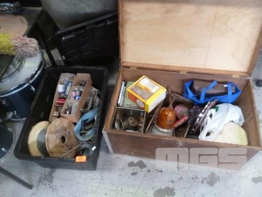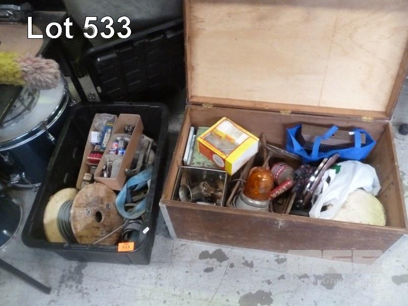 TIMBER TRUNK & CONTENTS, TOOLS, TINS, ETC &BLACK TUB WITH ELECTRONICS, TIE DOWNS,E TC