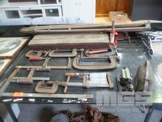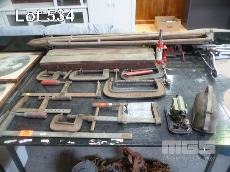 ASSORTED G & F CLAMPS, WILD THEODOLITE, TRIPOD, BOTTLE JACK ETC
