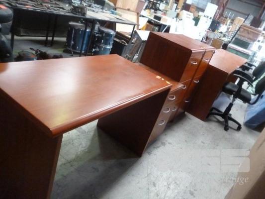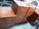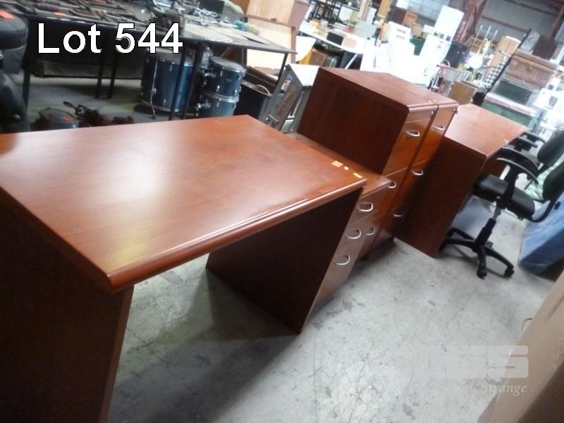 TIMBER VENEER 5 PIECE OFFICE SUITE, LONG DESK, 245cm (L), PAIR 3 DRAWER FILING CABINETS (WITH KEYS), MOBILE CABINET, 3 DRAWER & DESK, 117cm (L), WITH 2 x OFFICE CHAIRS