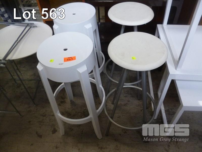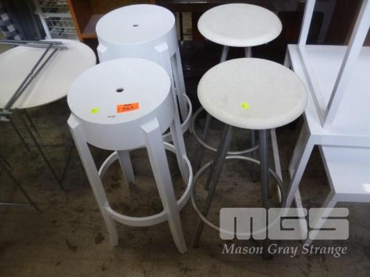 PAIR WHITE PLASTIC STOOLS & PAIR METAL FRAME STOOLS