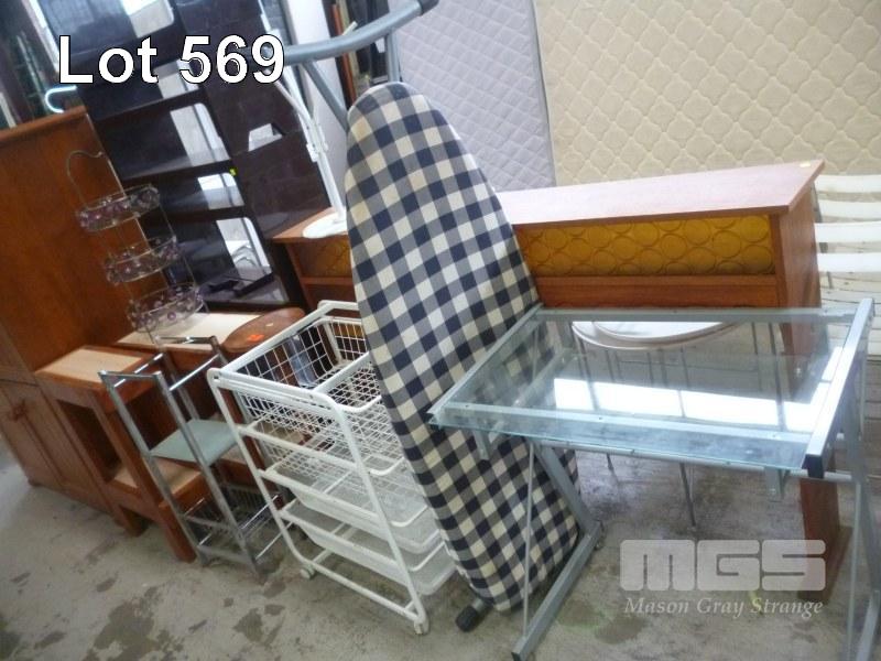 4 x ASSORTED SHELF UNITS, 2 x PEDESTALS, MOBILE DRAWER UNIT, STUDENTS DESK, OFFICE CHAIR, HUTCH & IRONING BOARD