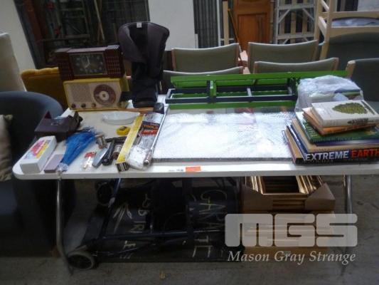 GOLD GILT PICTURE FRAMES, A-FRAME SIGN, MOBILITY WALKERS, PHILIPS VALVE RADIO, BOOKS ETC