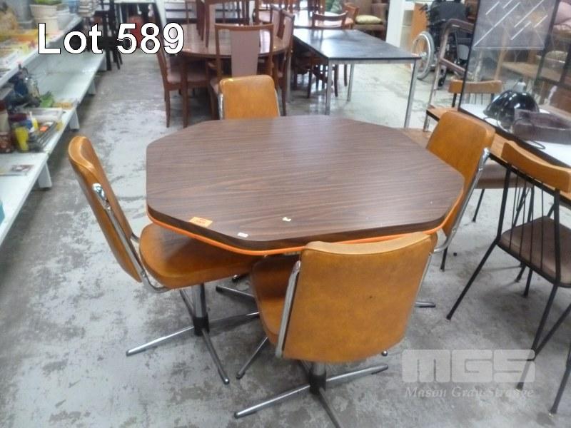 RETRO 5 PIECE DINING SUITE, OCTAGONAL TABLE, TIMBER LAMINATE TOP, CHROME SINGLE PEDESTAL, 4 x ORANGE VINYL SWIVEL CHAIRS
