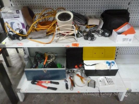 TOOLBOXES, HAND TOOLS, EXTENSION LEADS ETC (2 x SHELVES)