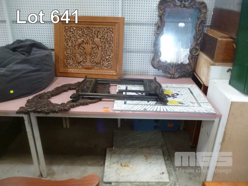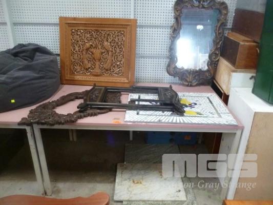 2 x GRANITE TOPS, WALL MIRROR, TIMBER CARVED WALL ART, MOSAIC ETC