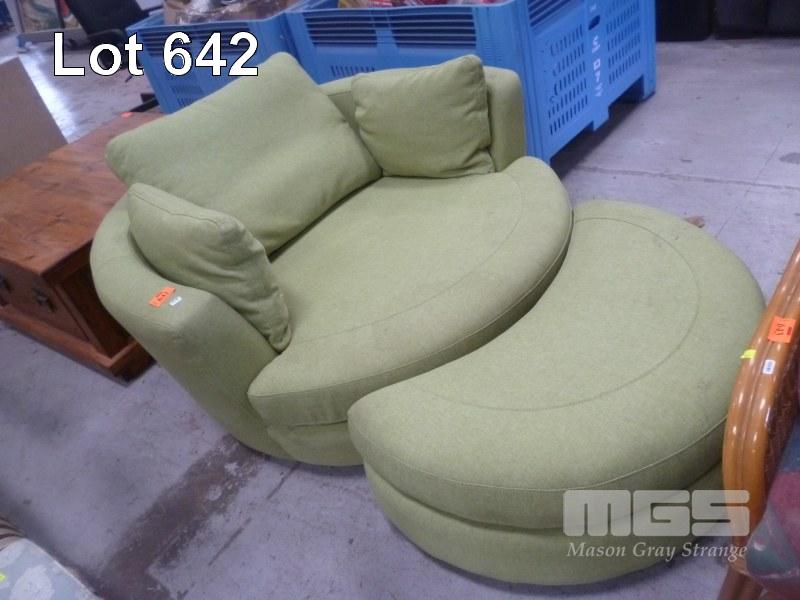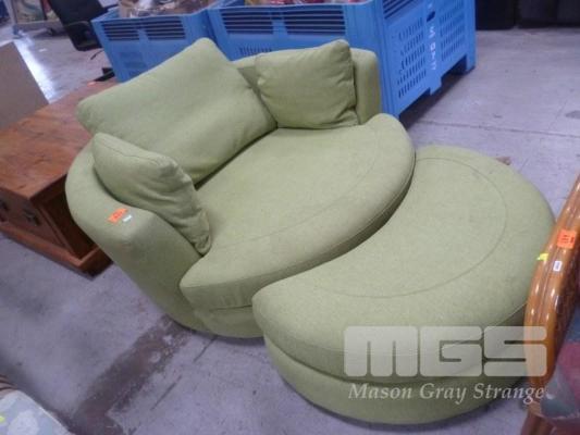 GREEN FABRIC UPHOLSTERED CIRCULAR LOUNGE, WITH CRESCENT OTTOMAN