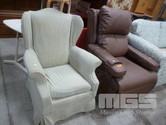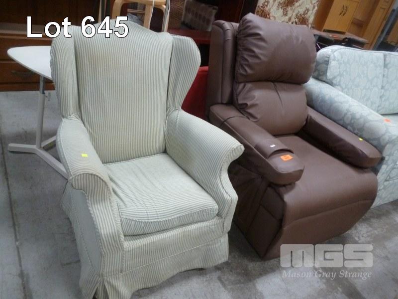 BROWN VINYL ELECTRIC LIFT CHAIR & GREEN/WHITE FABRIC ARMCHAIR, WING BACK, ROLL ARM