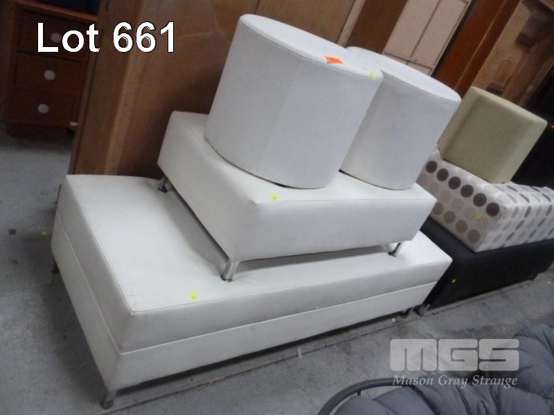 4 x BEIGE VINYL OTTOMANS INCLUDING LONG, CENTRE & PAIR SMALL ROUND