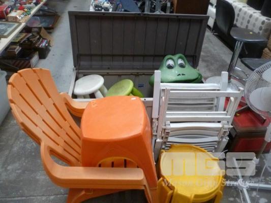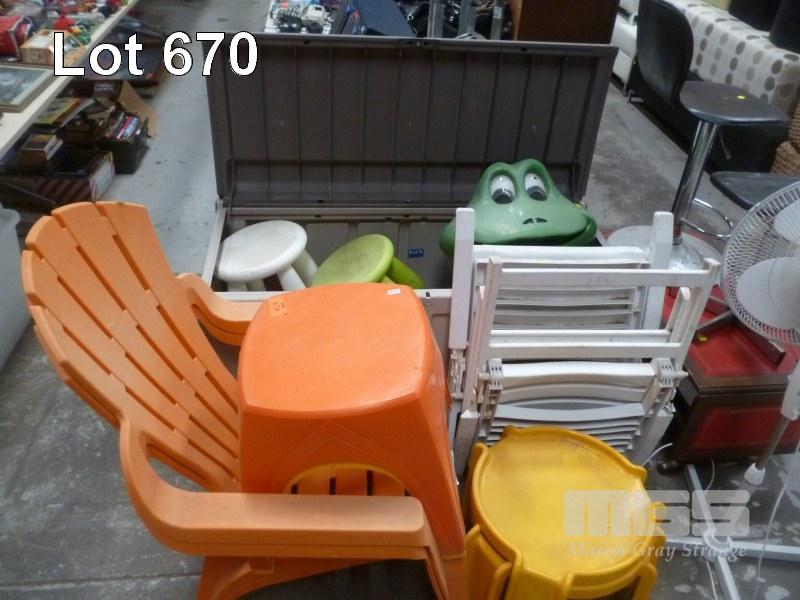 LARGE PLASTIC TRUNK, ASSORTED PLASTIC OUTDOOR CHAIRS & STOOLS