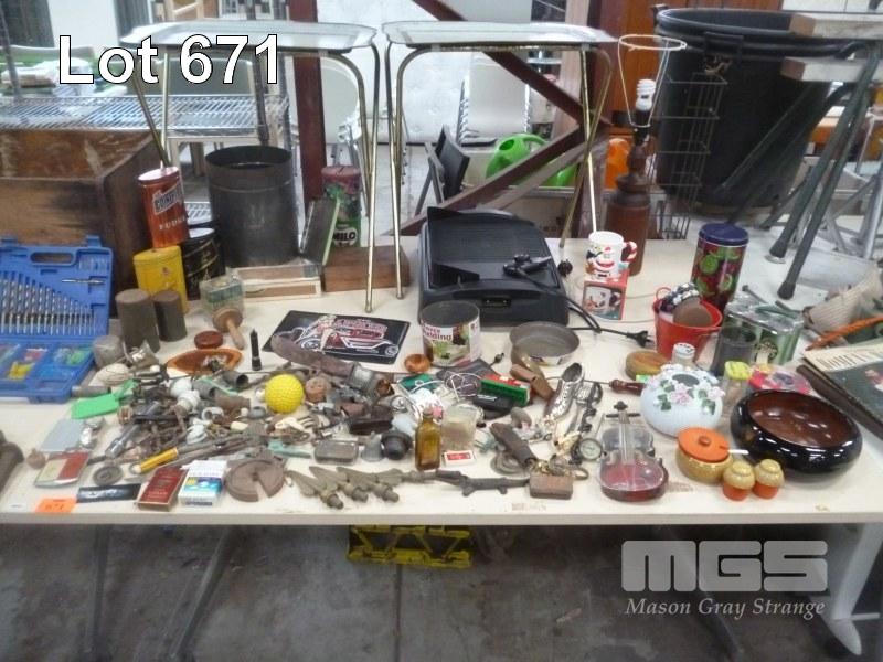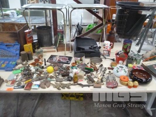 COLLECTION TINS, VINTAGE TABLES, SUNBEAM BBQ GRILL, CROCODILE BOTTLE OPENER & COLLECTABLES