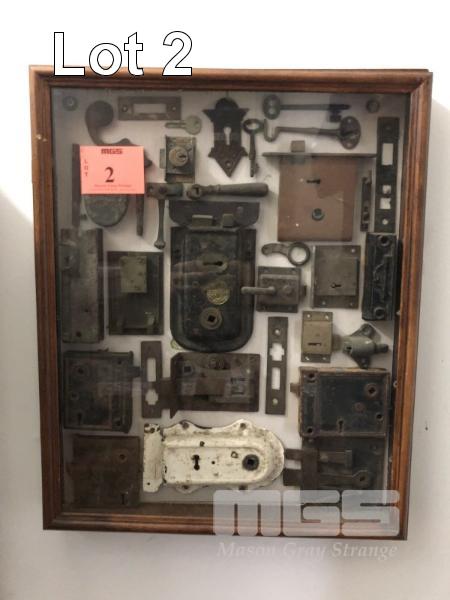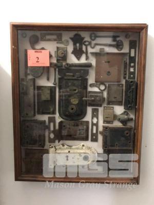 WALL MOUNT TIMBER GLAZED PANEL WITH ANTIQUE LOCK COLLECTION, APPROX 20 x PIECES