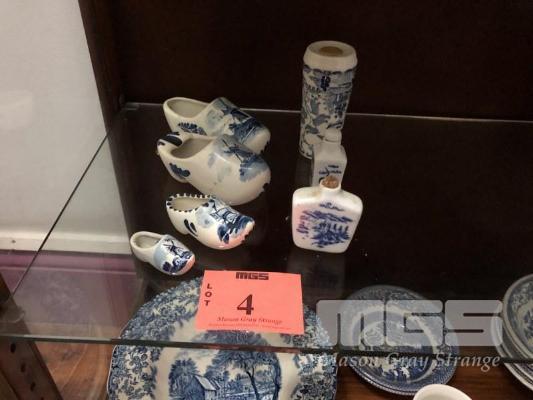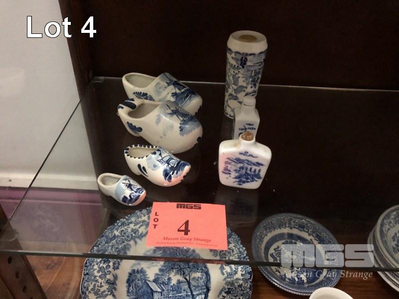 HOLLAND CHINA MINIATURES, 4 x CLOGS & 3 BOTTLES.