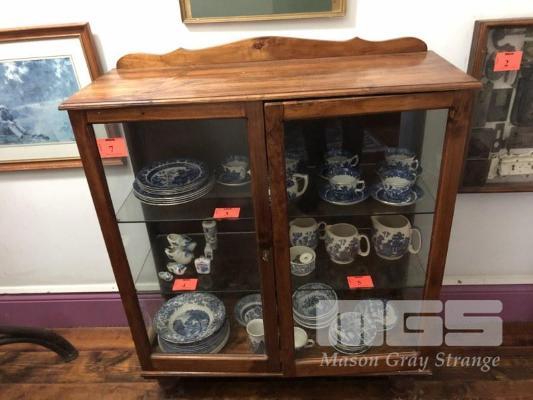 TIMBER GLAZED 2 DOOR CHINA CABINET. , 3 TIER, GLASS SHELVES, 970 (L) x 1110 (H) x 360mm (D)