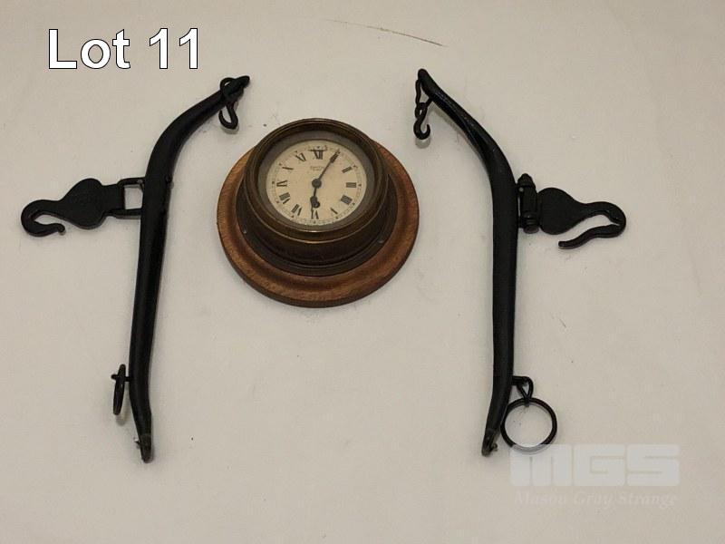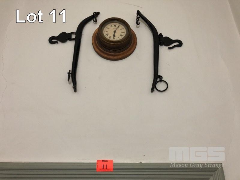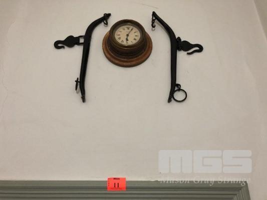 BRASS & WOOD WALL CLOCK & PAIR CAST FARM STOCK IRONS