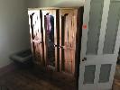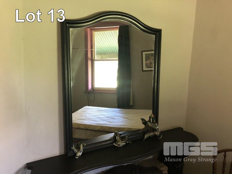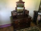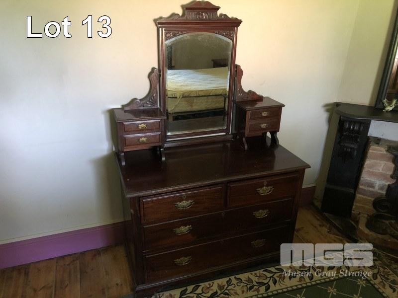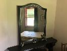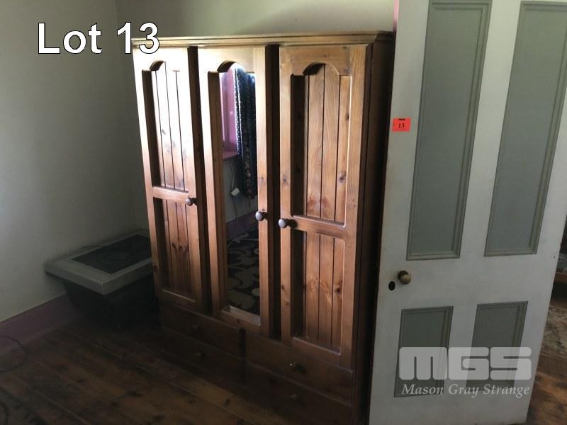 DOUBLE BEDTIMBER HEAD BOARD , 8 DRAWER TIMBER DRESSER, BEDSIDE CUPBOARD, TIMBER FRAME MIRROR, PRINT & RUG , 3 DOOR CUPBOARD (CONTENTS OF BEDROOM)
