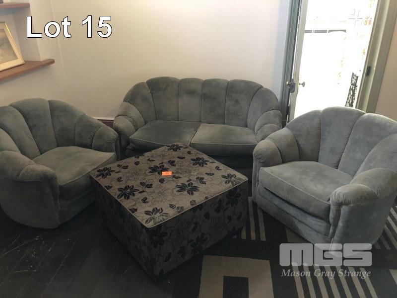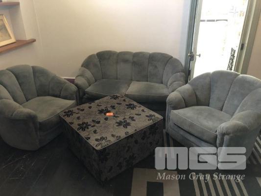 SOFT GREY FABRIC 3 PIECE LOUNGE, 2 SEATER & 2 x SINGLE SEATERS, LARGE SQUARE OTTOMAN & RUG