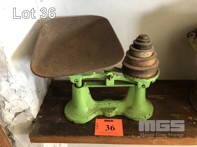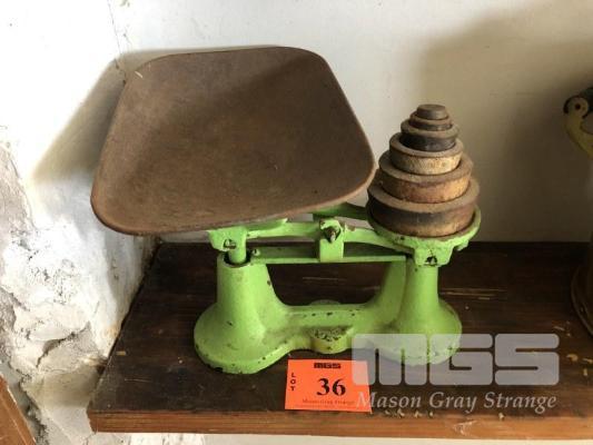 ANTIQUE SHELLEY BALANCE SCALE, 6 x WEIGHTS UP TO 2LB & TRAY