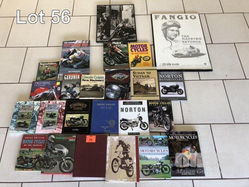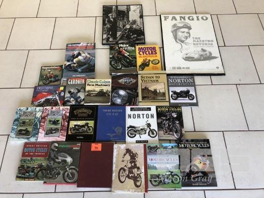 ASSORTED EARLY MOTORCYCLE BOOKS, VINCENT, NORTON, TRIUMPH & 2 x FANGIO & BRANDO PRINTS