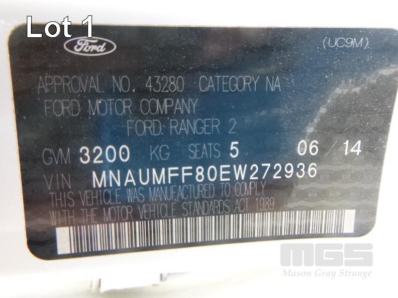 2014 FORD RANGER PX HI RIDER DUAL CAB UTILITY REG: S394 BCL (SA) VIN: MNAUMFF80EWZ72936 ENG: P4AT1184406 ODO: 224,382kms SHOWING 2.2 LITRE, 4 CYLINDER, 6 SPEED AUTOMATIC TRANSMISSION, DIESEL, WHITE DUCO, 4 DOORS, 5 SEAT, RWD ABS, AIR BAG, AIR CON, BLUETOOTH, CD PLAYER, CENTRAL LOCKING, CRUISE CONTROL, POWER STEERING, POWER WINDOWS, SIDE STEP, TONNEAU COVER, TOW BAR, TRACTION CONTROL, KEY #78 (WITH 1 KEY/S, WITH OWNER'S MANUAL, WITH SERVICE BOOKS) CONDITION: - INTERMITTENT ENGINE WARNING LIGHT - (NO LOGGED PROBLEM)