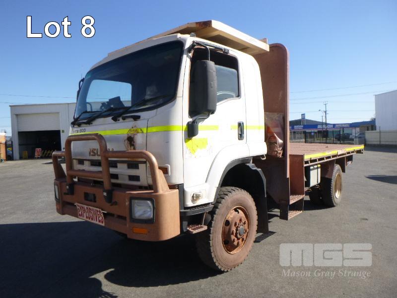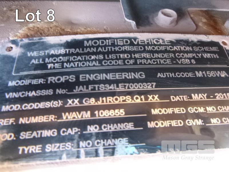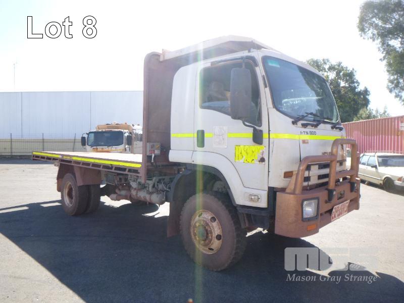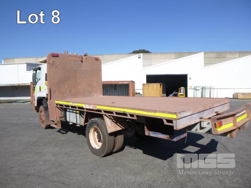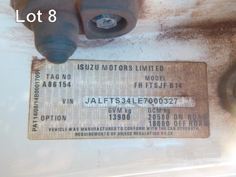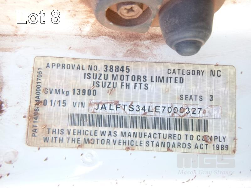 ISUZU FTS 800 F 4x4 FLATBED TRAY TRUCK REG: NO PLATES VIN: JALFTS34LE7000327 ODO: 64,288kms INDICATED GVM: 13,900 GCM: 20,500 LENGTH: 18' TRAY ISUZU, 6 CYLINDER, 6 SPEED MANUAL TRANSMISSION, DIESEL, SPRING SUSPENSION, WHITE DUCO, 11R22.5 2 DOORS, 3 SEAT, AIR CON, BULL BAR, DAY CAB, MINE SPEC, ROPS MOD 5/15, FIRE SUPPRESSION, EMERGENCY BRAKE, HYDRAULIC CRANE CONTROL UNIT (NO CRANE), PTO, STEP ACCESS TO TRAY, ISOLATORS EQUIPMENT RADIATION CLEARANCE - 31/08/2020 KEY #47 (WITH 1 KEY/S, WITH OWNER'S MANUAL) CONDITION: - RUST EVIDENT, DENTS, CHIPS, SCRATCHES CLUTCH - REQUIRES ADJUSTING PASSENGER MIRROR - BROKEN DRIVERS SIDE STEP - MISSING - ENGINE WARNING LIGHT ON