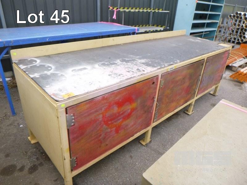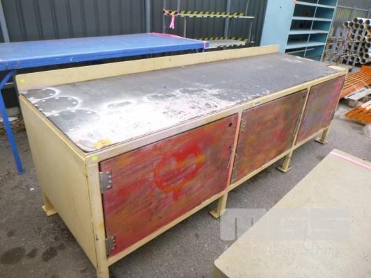 STEEL WORKBENCH, 90 x 300cm 3 x TIMBER DOORS, RUBBER MATTING