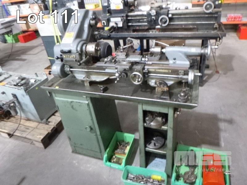 CENTRE LATHE, MYFORD MOD: SUPER 7 400mm BC 175mm SWING 20mm BORE SPINDLE SPEED 90-2150 RPM 100mm 3 JAW CHUCK #2 MT TAIL STOCK 13mm CHUCK 4 WAY TOOL POST, 240V ON ORIGINAL STAND WITH GEAR CHANGE SET, 100mm 3 JAW CHUCK WITH REVERSE JAWS, 150mm 4 JAW CHUCK, 170mm FACE PLATE, 2 POINT STEADY, BACK TOOL POST, LIVE CENTRE & MANUAL