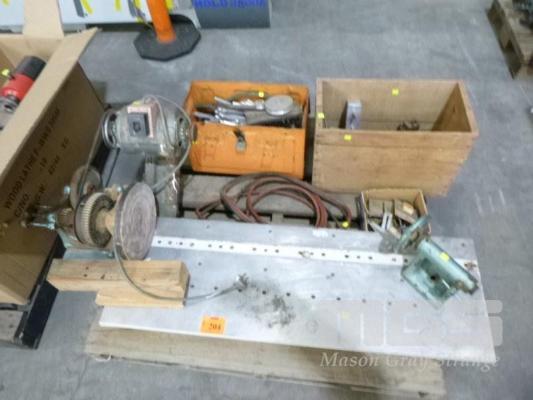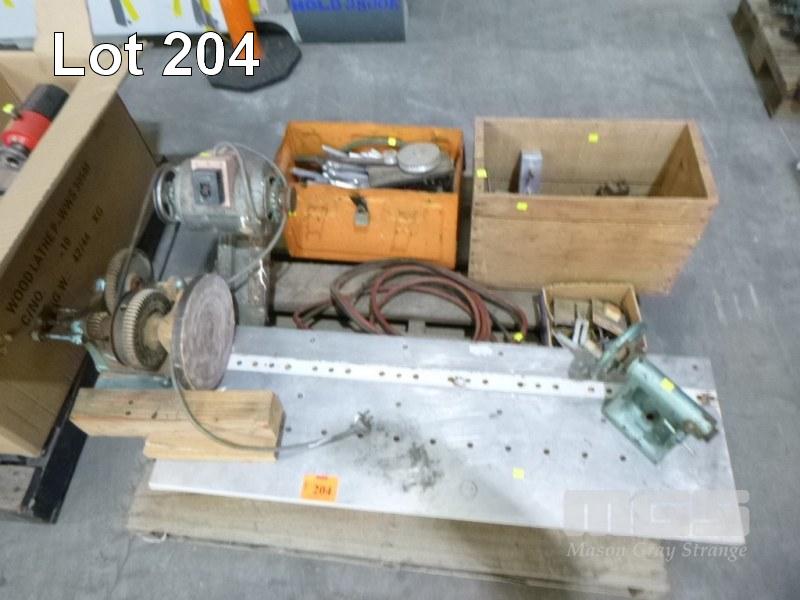 FABRICATED WOOD LATHE/DISC SANDER 115cm FLAT BED 1/3HP, 240V, (NO GUARDING) WITH ASSORTED LATHE ACCESSORIES, OXY HOSE, ALLOY PINS, FASTENERS & BENDER 1 x PALLET