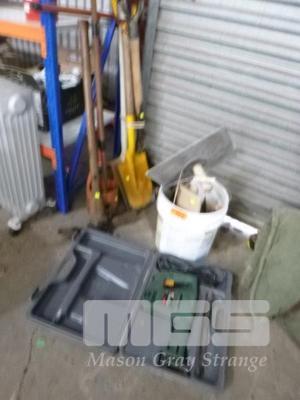 GARDENING TOOLS, TROWELS, SPADE, SHOVEL, MATIK, FORK, BOSCH PRUNING SAW & POST HOLE DIGGER