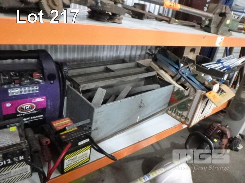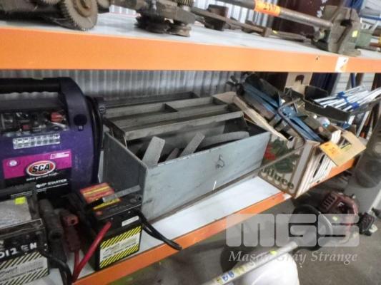ASSORTED HAND TOOLS, GREASE GUN, CHAINS, SCISSOR JACK, GRINDING STONES, 3 x JUMP PACKS ETC