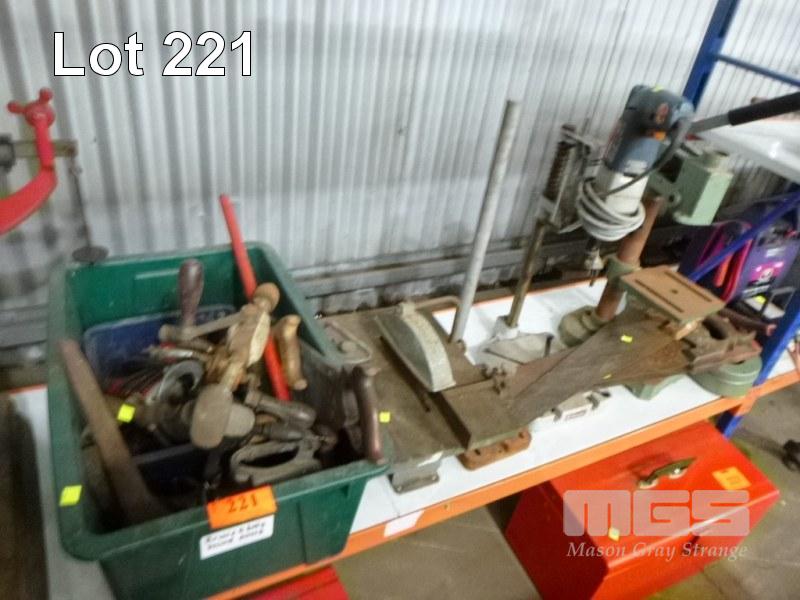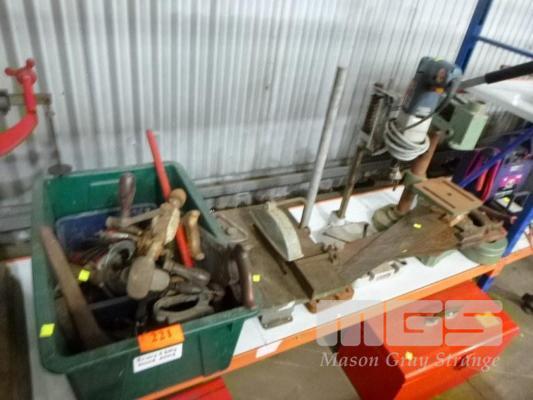 BENCHTOP DRILL PRESS FITTED WTIH BOSCH 500w GEARED DRILL, 240V WITH 2 x PART DRILL PRESS FRAMES, ASSORTED HAND SAWS, ROUTER, HAND DRILLS & BENCHTOP TABLE SAW